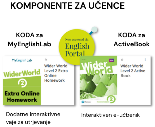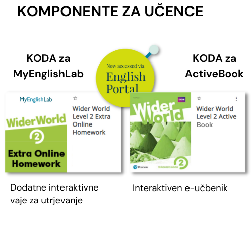 MY ENGLISH LAB ZA UČENCE zajema dostop do dodatnih nalog slušnega razumevanja na podlagi BBC Vox Pops videov iz učbenika, vse video posnetke iz učbenika, vse slušne posnetke ter dostop do Extra Online Homework z interaktivnimi nalogami.