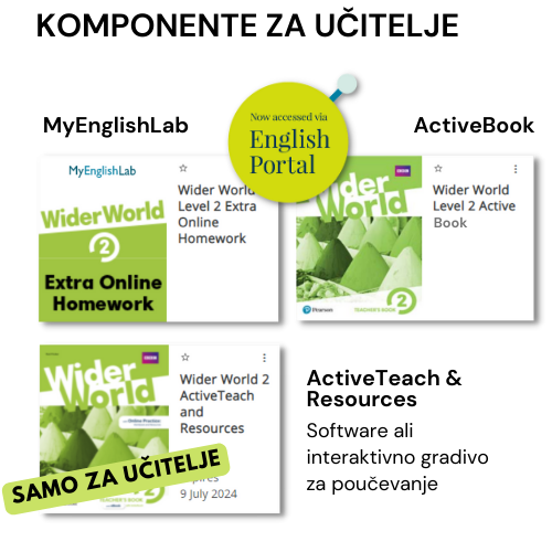 TEACHER’S RESOURCES zajema Assessment Package s 542 različnimi fotokopinimi predlogami, ki zajemajo različne oblike preverjanj, Grammar Presentations v obliki PowerPoint predstavitve, smernice za poučevanje z Wider World online, snemljive avdio in video posnetke, ter dodatne fotokopirne naloge, ki sovpadajo s oisameznimi poglavji.