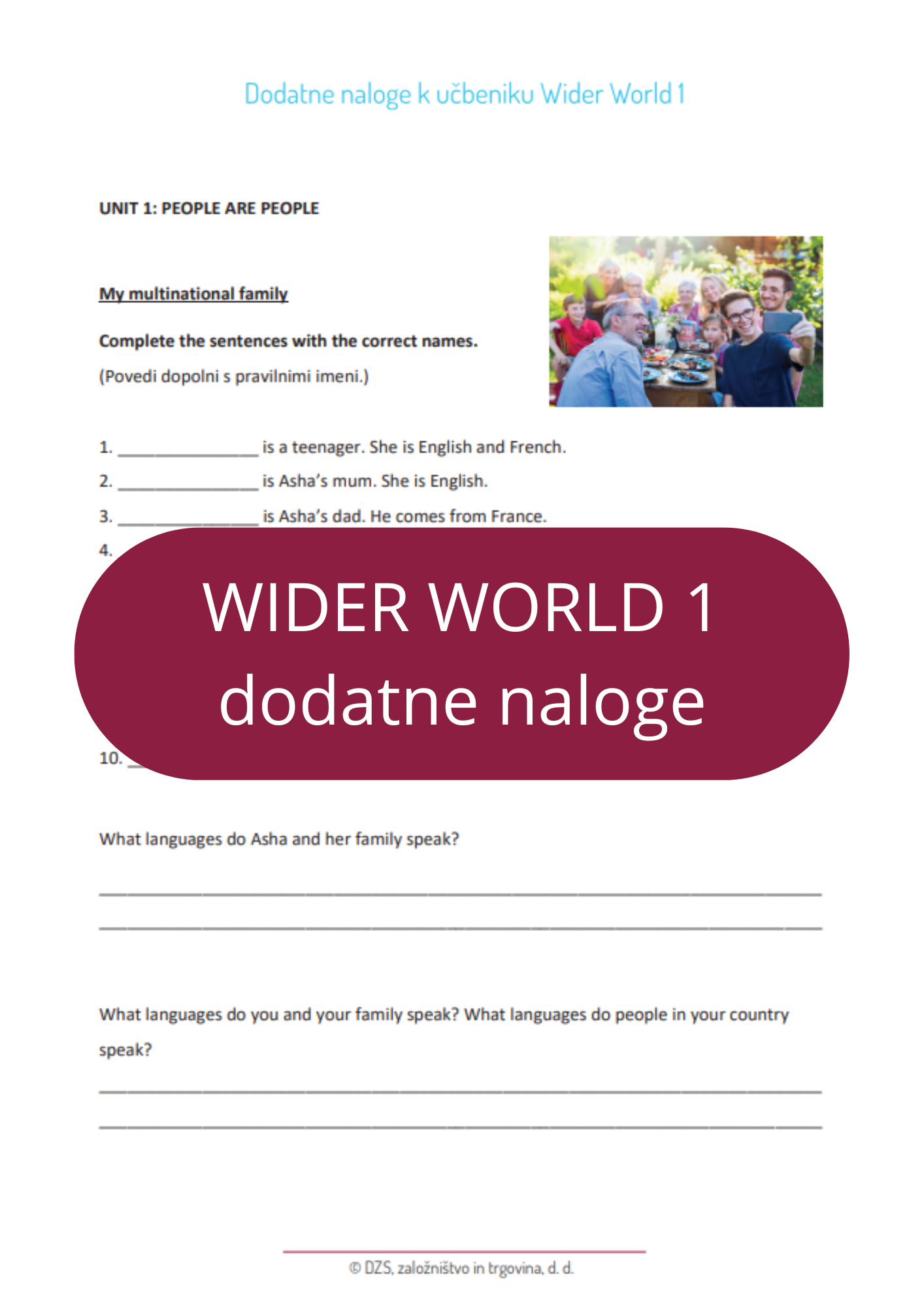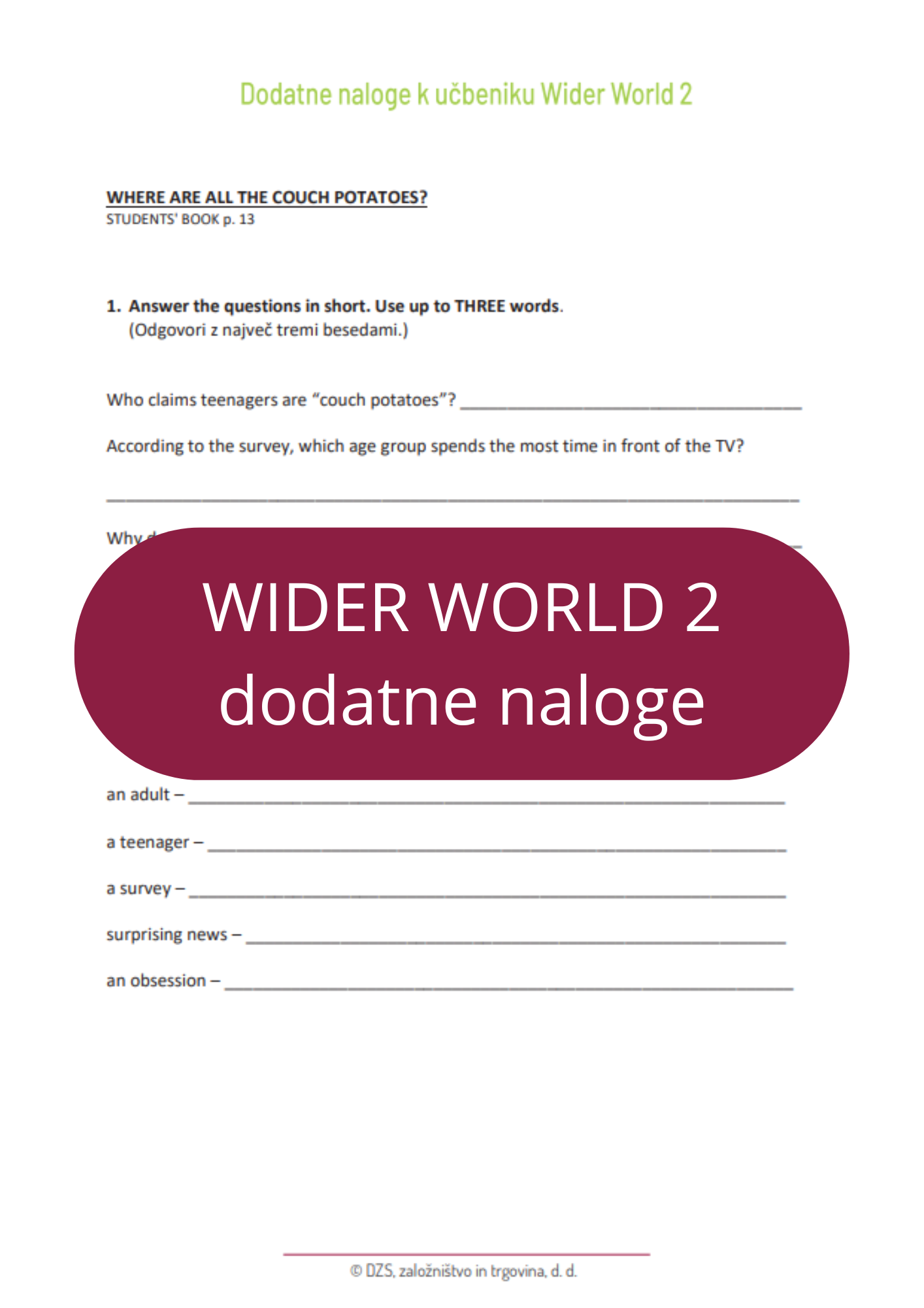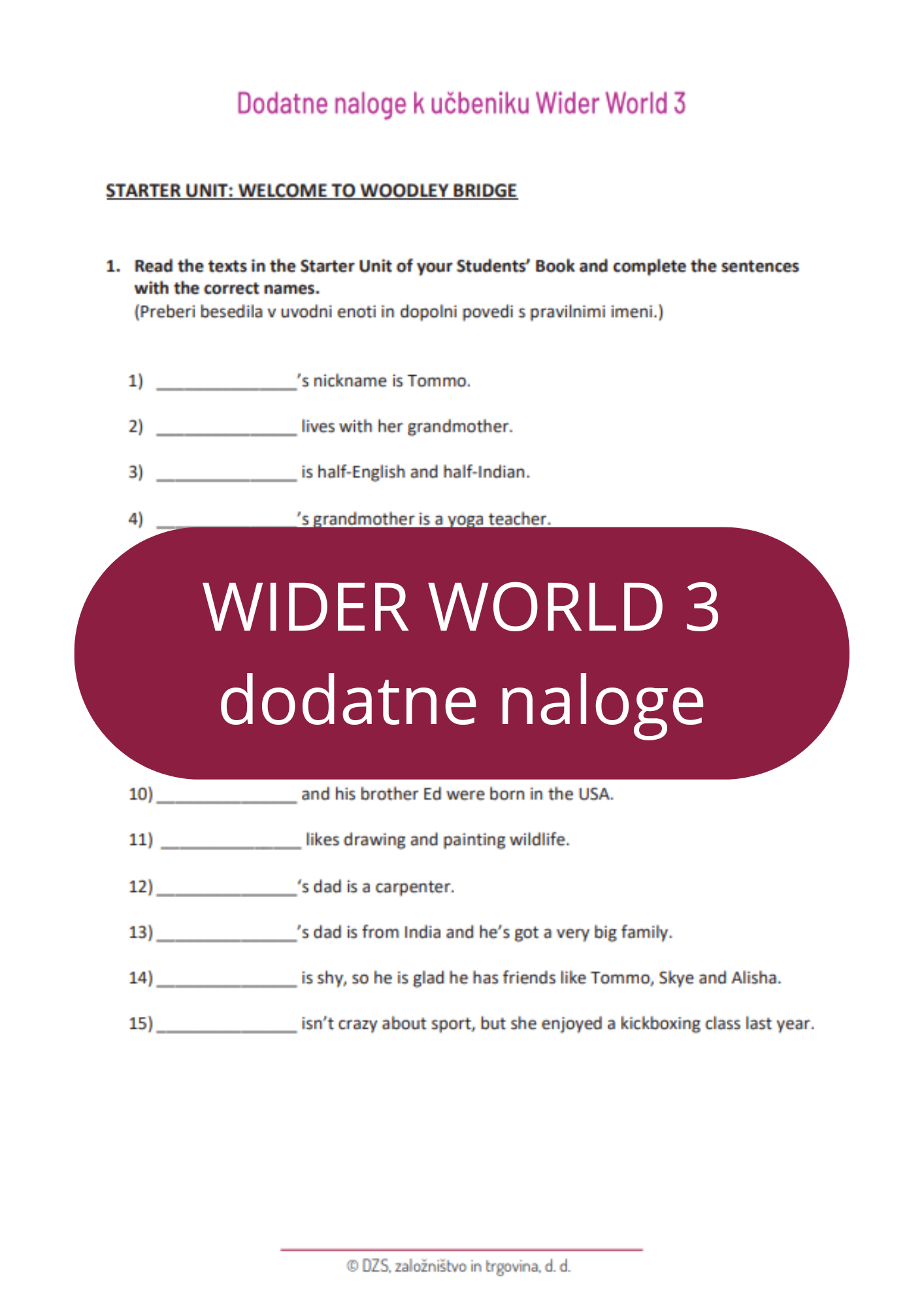 Pred vami so dodatne vsebine k učbenikom za angleščino Wider World. Učbeniki prinašajo zanimive teme iz celega sveta, spoznavali boste vrstnike iz različnih dežel, njihove navade in značilnosti držav, iz katerih prihajajo. Učenje jezika je namreč okno v svet, z jezikom ne le komuniciramo, ampak spoznavamo kulturo in način življenja ljudi, ki ga govorijo. Ko spoznavamo različne jezike in kulture, hkrati spoznavamo tudi lastno, saj vedno pomislimo: »Kako pa je to pri nas?« Naloge, ki so pred vami, vas bodo kdaj spomnile na to, da pomislite tudi na svojo kulturo in način življenja, vendar se lahko vprašate večkrat, tudi kadar vas naloga ne opozori na to. Namen učenja jezika je tudi spodbujanje radovednosti in vedoželjnosti in več kot boste znali jezika in jezikov, več informacij boste lahko poiskali.
