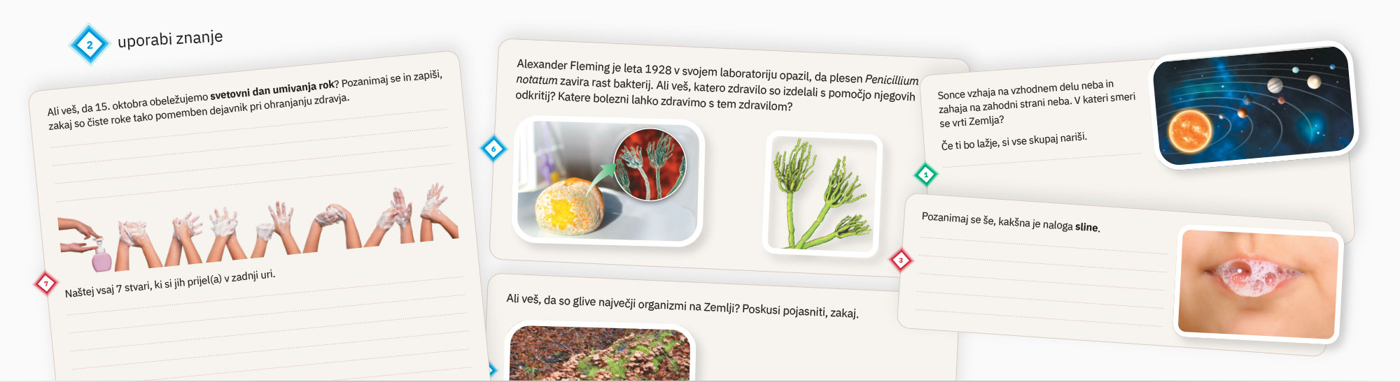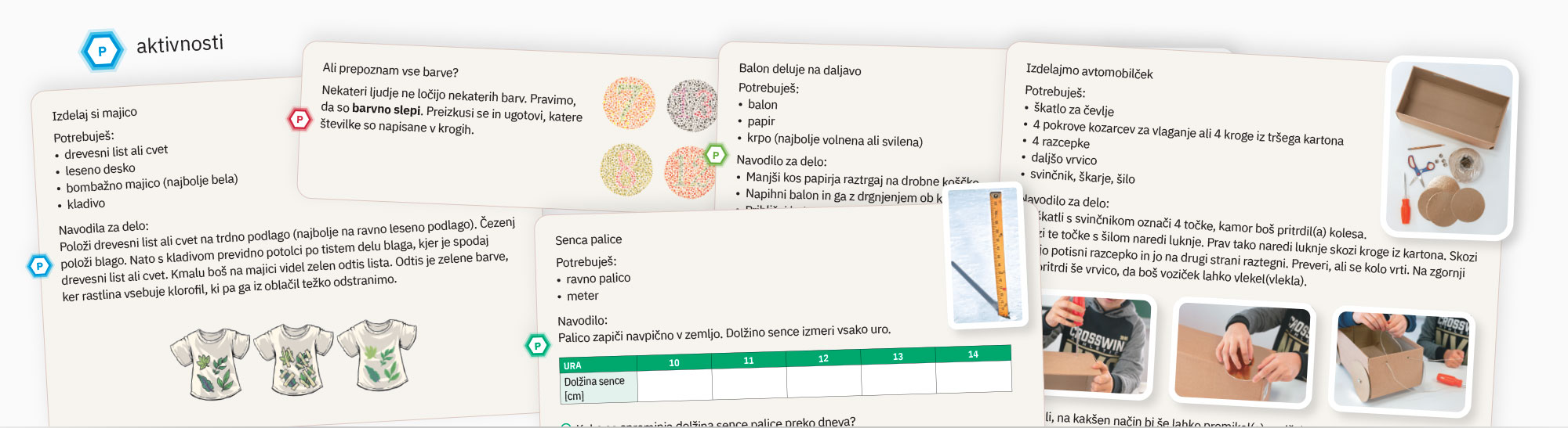 Teorijo nadgrajujejo raziskovalne naloge ali naloge odprtega tipa, ki so povezane z otrokovimi izkušnjami in spodbujajo samostojen miselni proces ter uporabnost teoretičnega znanja.