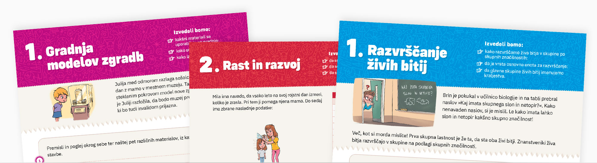 Zgodbe sovrstnikov prikažejo prepletenost učne snovi z vsakdanjim življenjem in spodbujajo radovednost že na začetku vsake učne enote. Element učnih ciljev spodbuja soudeleženost učencev pri določanju in razumevanju namenov učenja in kriterijev za uspeh.