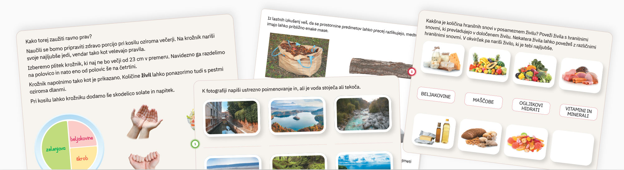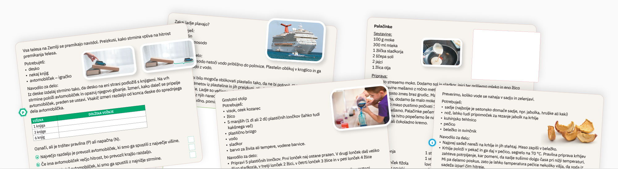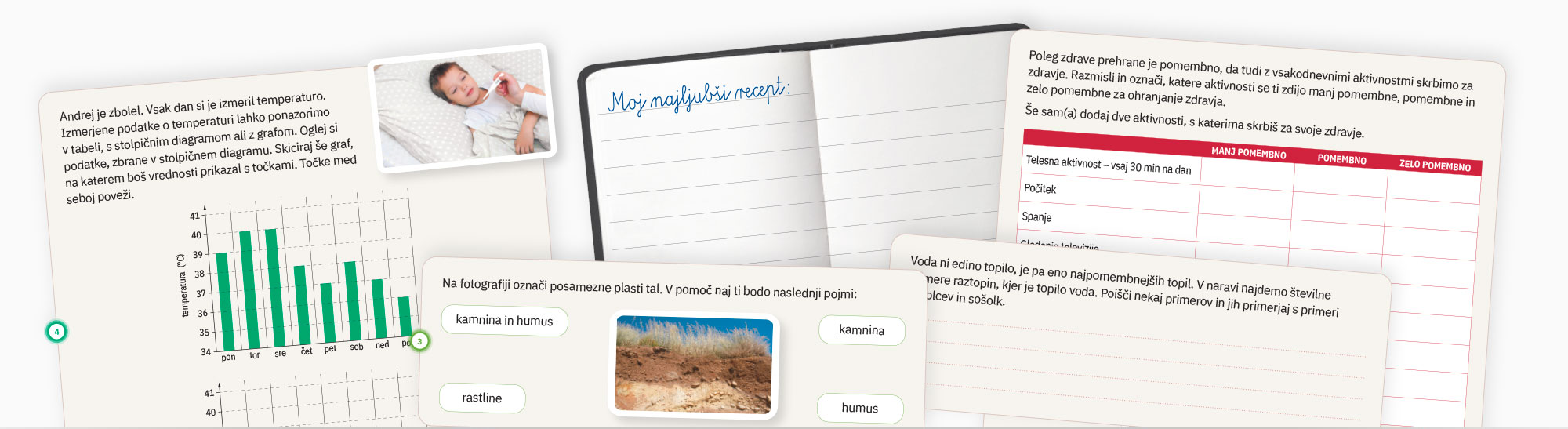 Raznolike naloge za premišljevanje in pisno izražanje ali grafično podprte naloge za delo s tabelami, grafi in drugimi vizualnimi pripomočki.