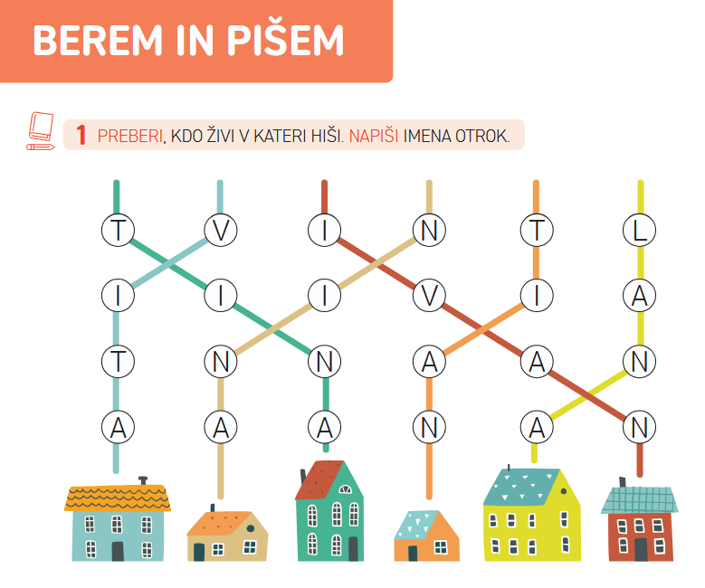 Vsaka nova črka je predstavljena skupaj z malo tiskano črko, spremlja pa jo večja ilustracija, ki se vsebinsko navezuje na obravnavano črko ter na naloge v poglavju.