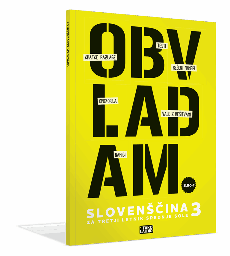Vadnica za slovenščino vsebuje bogat izbor v treh poglavjih: splošna vsebina, vaje, testi in rešitve. V vsakem poglavju kratko in pregledno prikažejo postopke za reševanje najpogostejših nalog. Vaje so raznolike in različnih stopenj zahtevnosti. Dijak svoje znanje preveri s preizkusi znanja, katerim so na koncu vsakega poglavja dodane tudi rešitve.