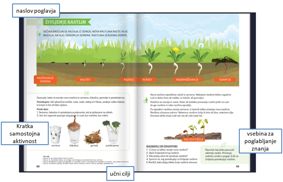 Učbenik je razdeljen na devet poglavij, v katerih učencem s preprostimi razlagami in bogatim slikovnim gradivom približa naravoslovje in družboslovje. Vsako poglavje sestavljajo zanimive naloge in samostojne aktivnosti (poskusi, izdelava izdelkov), ki spodbujajo kritično mišljenje, opazovanje in raziskovanje. Vsako poglavje vsebuje tudi razdelek Razmisli in odgovori, s katerim učenci ponovijo in nadgradijo svoje znanje. Učbenik vsebuje bogato slikovno gradivo, ki učencem pomaga pri učenju novih pojmov.