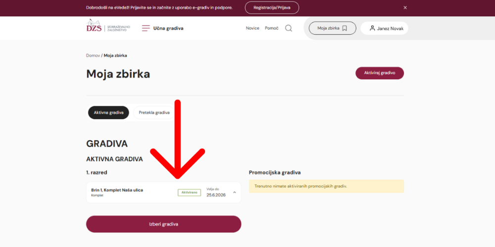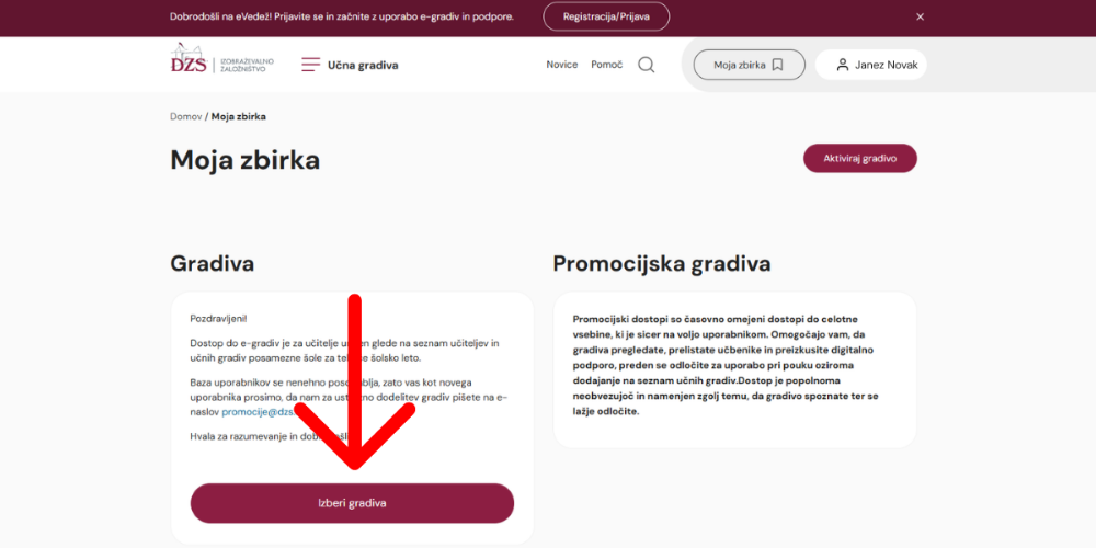 Po uspešni registraciji odprite razdelek MOJA ZBIRKA in kliknite gumb IZBERI GRADIVA. Odprla se bo zbirka gradiv vaše šole. Med ponujenimi naslovi izberite tista gradiva, ki jih potrebujete, s klikom na gumb IZBERI GRADIVO.