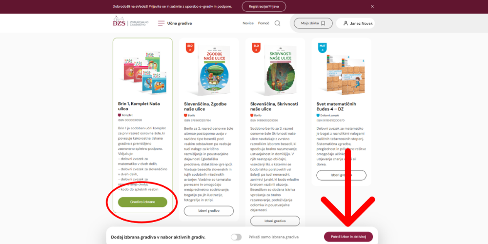 Ko označite vsa želena gradiva, kliknite gumb POTRDI IZBOR IN AKTIVIRAJ. Vaša izbrana gradiva se bodo nato prikazala v razdelku MOJA ZBIRKA → AKTIVNA GRADIVA.